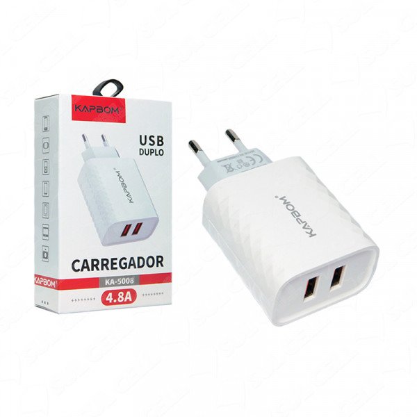 A Fonte USB Turbo 4.8A Kapbom KA-5008 é um carregador de parede de alta potência, projetado para fornecer carregamento rápido e eficiente para seus dispositivos eletrônicos. Com duas portas USB, permite carregar até dois dispositivos simultaneamente.